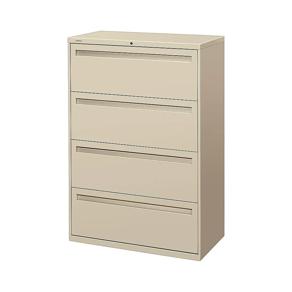 Put important documents on lock-down with this four-drawer lateral file cabinet. A HON One Key removable lock ensures secure storage of confidential files, and the interchangeable core allows personalized security. Depend on each of the full-width recessed handle-equipped drawers for 2.96 cubic feet of filing space. This HON Brigade 700 Series lateral file cabinet has a built-in counterweight for stability.