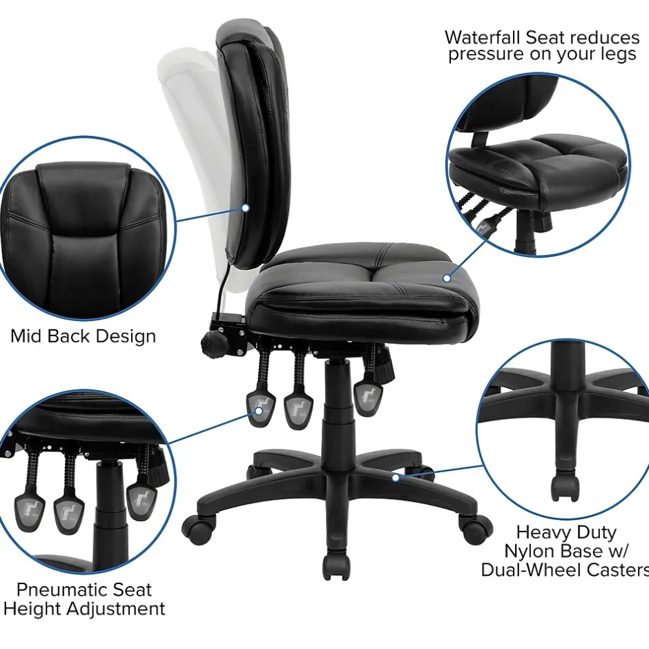 This amazing ergonomic task office chair featuring pillow top cushioning and multiple adjusting capabilities will keep you comfortable no matter your workload. This office chair boasts soft and durable black LeatherSoft upholstery to keep you comfortable through your work day or while browsing the internet. The contoured seat dissipates pressure points for greater comfort. A mid-back office chair offers support to the mid-to-upper back region. The locking back angle adjustment lever changes the angle of your torso to reduce disc pressure. The locking synchro tilt control allows the chair’s back and seat to recline at different rates, increasing the angle between your torso and thighs. The waterfall front seat edge removes pressure from the lower legs and improves circulation. Chair easily swivels 360 degrees to get the maximum use of your workspace without strain. The pneumatic adjustment lever will allow you to easily adjust the seat to your desired height.