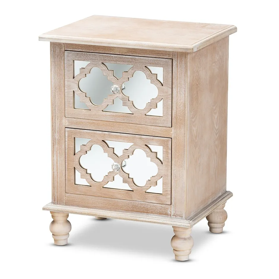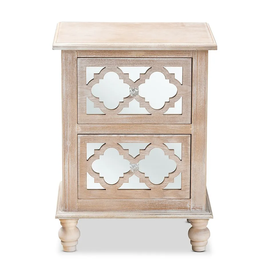 A unique mix of rustic and glam makes the Celia nightstand a chic bedside companion. This wood nightstand displays a white-washed oak finish for an aged, vintage look. Two drawers provide ample space to store all the bedroom essentials. Mirrored glass adds a hint of glamour and highlights the elegant quatrefoil pattern layover. Crystal knobs and turned feet add an extra dose of charm. The Celia nightstand is made in China and will arrive fully assembled.