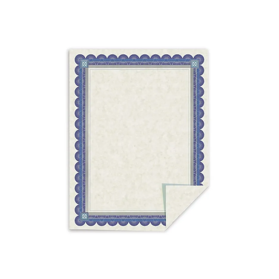 - Made of 24 lb. ivory paper with a blue/silver foil-enhanced border and parchment finish
