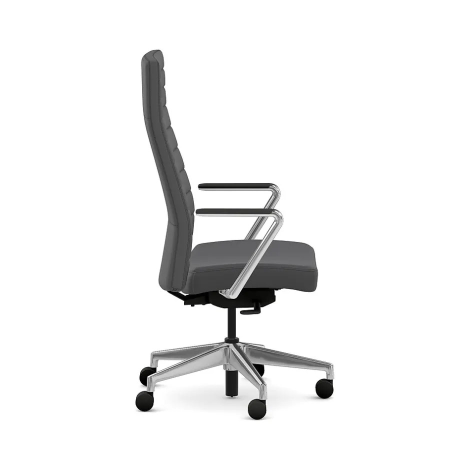 - Contourett graphite gray fabric upholstery with black stitching, and polished aluminum arms and base