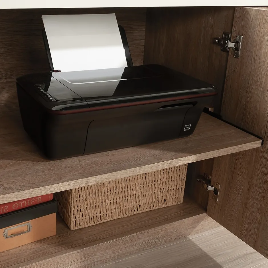The strong and lightweight panel construction of the file credenza from the Dixon City collection allows for enhanced presence and easier portability in your home office space. The base of this residential office furniture is finished in the natural tones of Brushed Oak with a Pebble White accent finish on the top surface, for a glowing contrast. An adjustable, slide-out printer shelf with full extension slides behind the left set of doors provides easy to access to office equipment in this office credenza with doors. Behind the right set of doors includes a pull-out, hanging file storage rack with full extension slides, which holds letter or legal-size hanging files. In addition, behind each set of doors is an additional storage shelf, with plenty of room for office supplies, making organization a snap for commercial office storage, at home, or anywhere. Finished on all sides for versatile placement, this office storage credenza meets BIFMA standard x5.9 for safety, durability, and structural performance. Invite the country chic style of modern farmhouse into your office space with this multifunctional storage phenomenon.