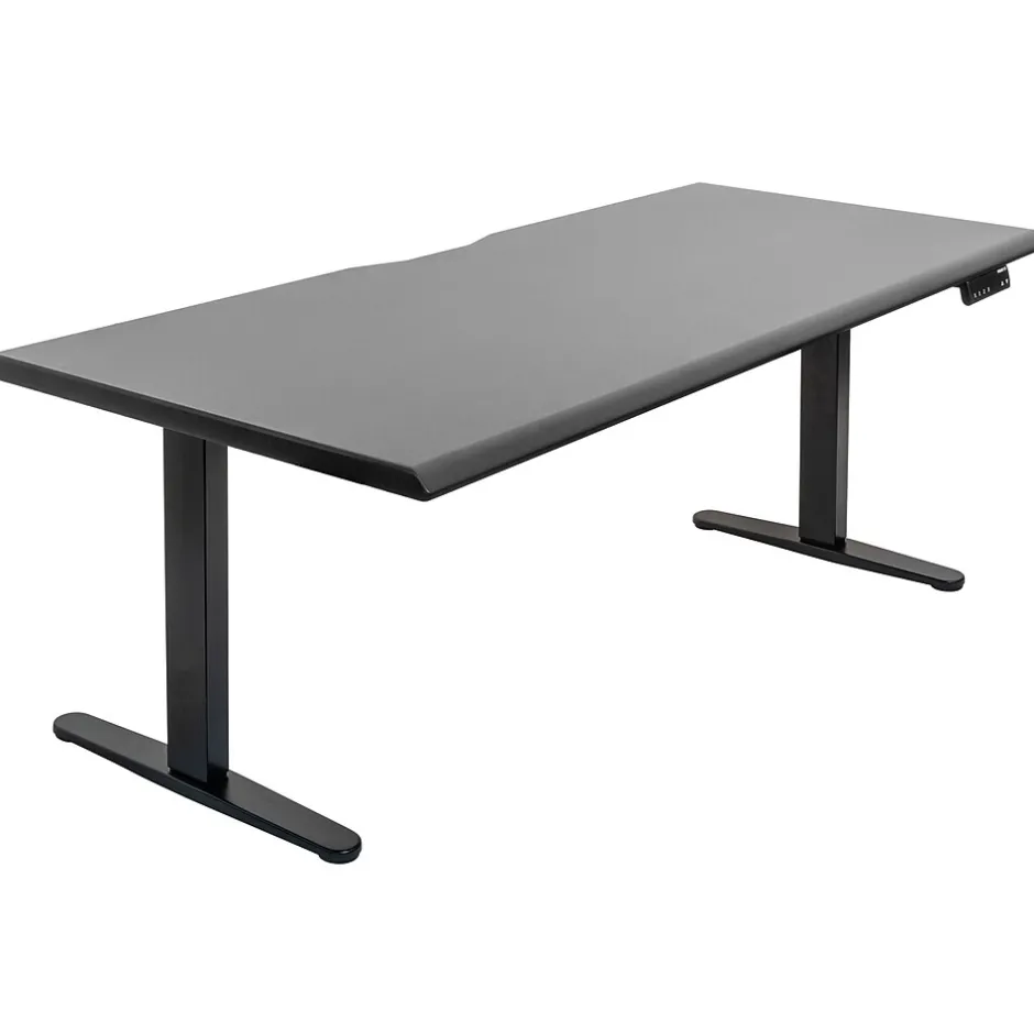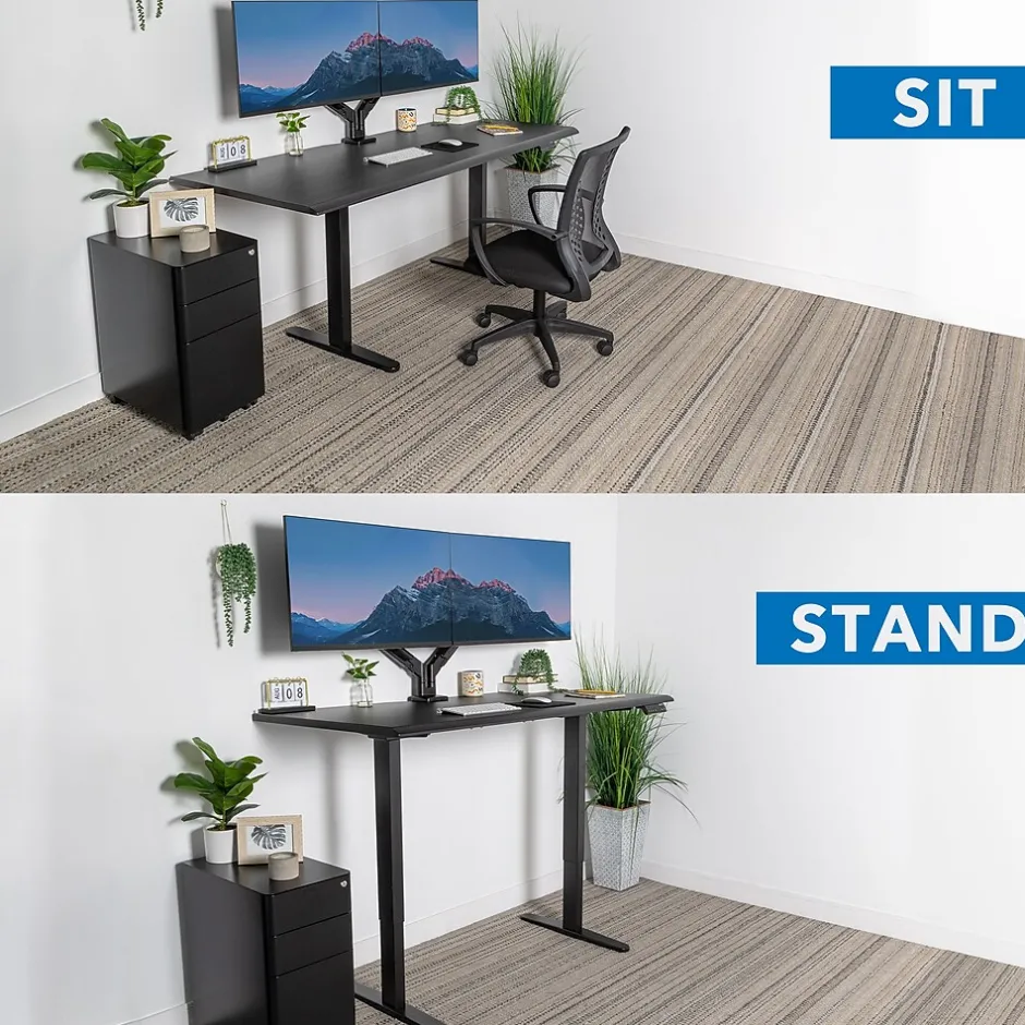 - Height adjustable sit-stand desk with a dual-motor system, constructed from durable MDF and black steel legs.