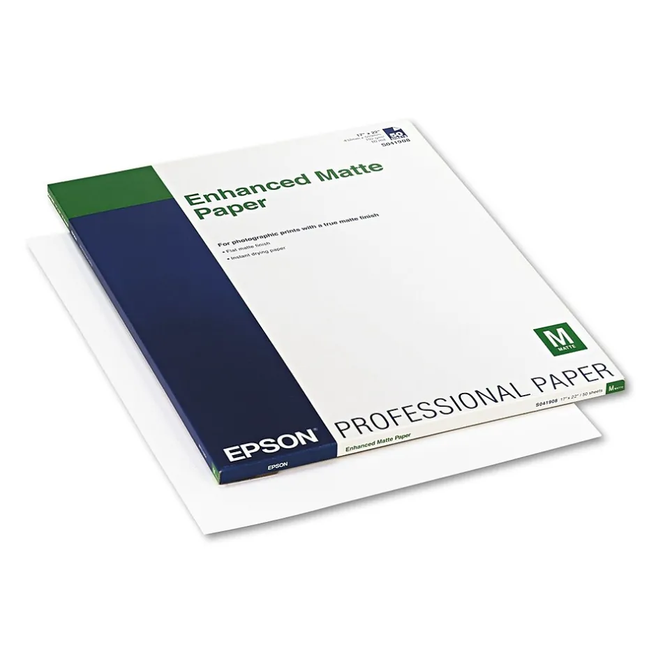 EpsonĀ® Ultra premium presentation paper in white color measures 17″ x 22″ and is suitable for ultra Chrome, archival, durabrite Ink and compatible with dye-based Ink. Yields highly saturated images, while maintaining highlight and shadow detail. Works with stylus photo 2000P, Stylus Color 3000, Stylus Pro 5000, 5500, 7000, 7500, 10000. Features matte surface that offers the optimum photographic platform. Comes with 1440 dpi print resolution for the highest quality output and has a 192 g/m2 of basis weight with thickness of 10.3 mil. Features widest possible color gamut for professional images and offers instant drying capability with EPSON professional Inks allows for easy handling.