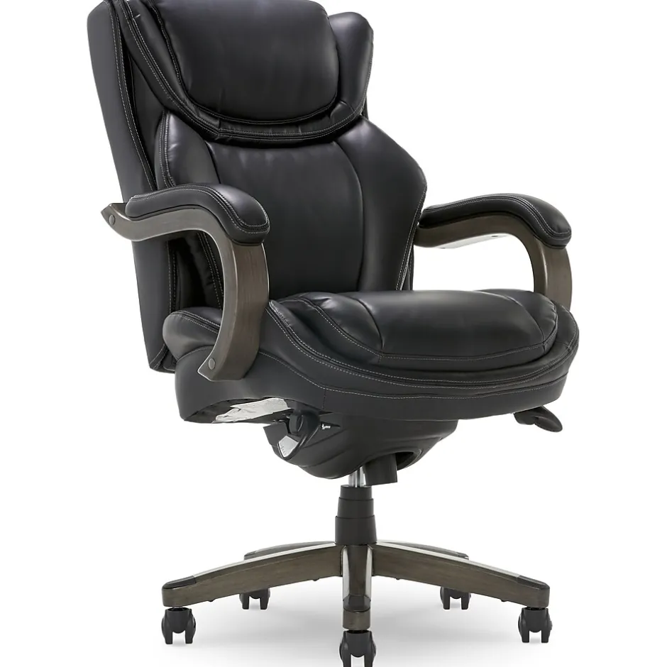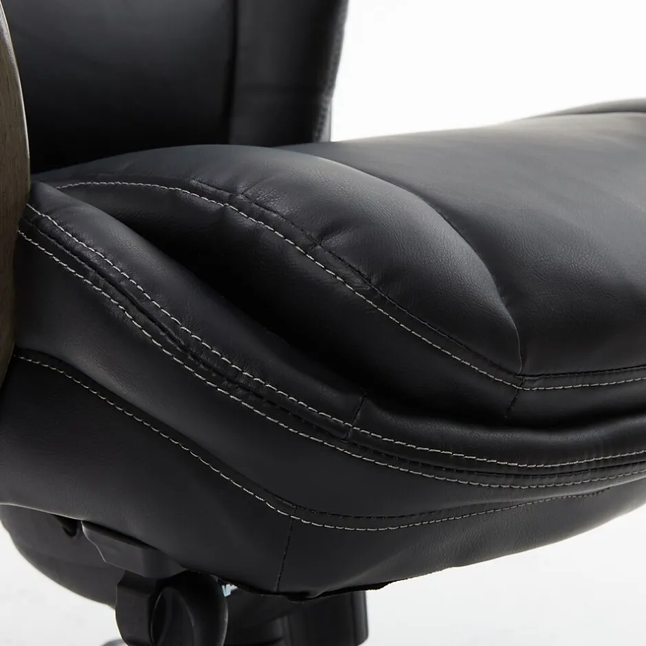 This La-Z-Boy Harnett executive office chair is designed for comfort by offering superior ergonomic features, with unique style. The chair uses ComfortCore, an advanced foam layering system that offers zone-based support through strategic cushion mapping. This executive office chair features soft support at the front of the cushion, firmer support at the back of the cushion, and poly fiber fill comfort top layer for supreme comfort.