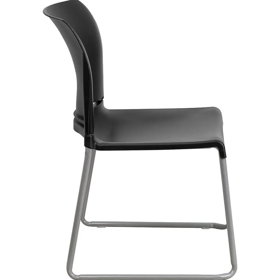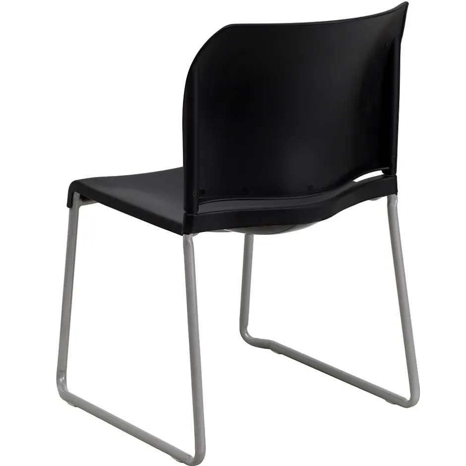 Flash Furniture HERCULES™ ergonomic black stacking chair has a silver powder coated frame finish with contoured polypropylene black colored seat and back for an elegant look. 880 lbs capacity chair has a sled base and is sold as 20 per pack.