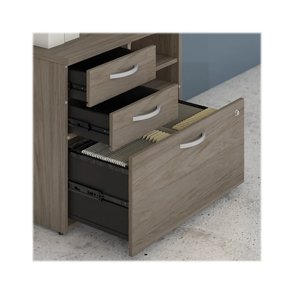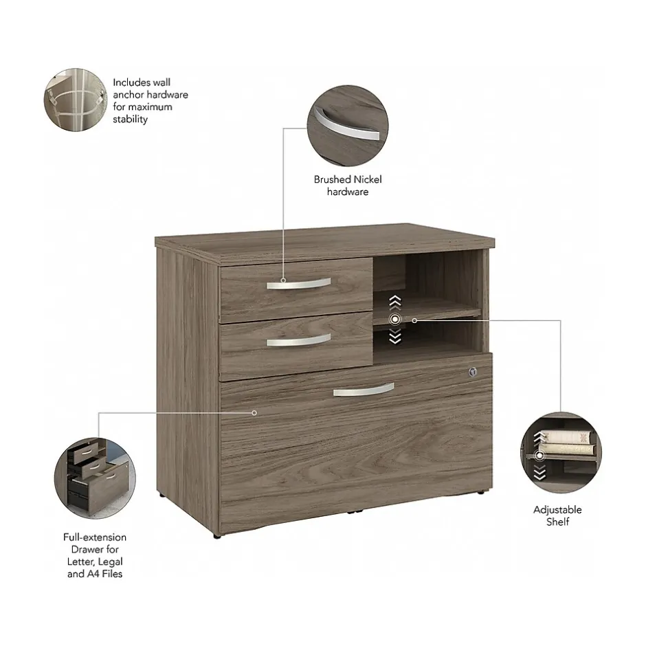 The Bush Business Furniture Hybrid office storage cabinet with drawers and shelves offers a stylish, long-lasting workplace organization solution for the modern professional. Keep important documents, office supplies, work in progress, and equipment in order, so you can access the materials you need quickly and easily. A file drawer opens on smooth full-extension ball bearing slides for an effortless reach to letter-, legal-, and A4-size paperwork and can be locked to protect sensitive information. Two box drawers organize writing utensils, notepads, and other supplies, while the open shelves are ideal for frequently used items. The file storage cabinet’s stable design and included wall attachment hardware make it a safe choice for use in virtually any home or professional office environment. Find the perfect look for your space with five contemporary finish options: black walnut, modern hickory, platinum gray, storm gray, and white. This lateral file cabinet with shelves has been meticulously tested to meet or exceed ANSI/BIFMA quality standards for safety, durability, and performance and is backed by the Bush Business Furniture 10-year manufacturer warranty. See the full Bush Business Furniture Hybrid collection for coordinating items to enhance your workspace as needed, including computer desks, bookcases, and storage cabinets (coordinating items sold separately). American-made with US and imported parts.