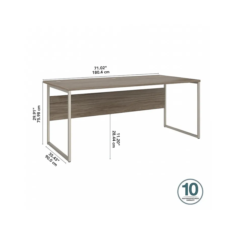 The Bush Business Furniture Hybrid 72″W x 36″D computer table desk blends a durable work surface with sturdy metal legs to offer a stylish, long-lasting solution for the modern professional. Tackle your next project or assignment with a computer, books, and more on a desktop that supports up to 200 lbs. Three built-in wire management grommets keep cords and cables in order, so your work area remains free from unnecessary clutter. The computer desk’s open leg design and finished privacy panel allow it to look great facing any direction in a home or professional office. Find the perfect look for your space with five finish options: black walnut, modern hickory, platinum gray, storm gray, and white. This modern desk has been meticulously tested to meet or exceed ANSI/BIFMA quality standards for safety, durability, and performance and is backed by the Bush Business Furniture 10-year manufacturer warranty. See the full Hybrid collection for coordinating items to enhance your workspace as needed, including bookcases, lateral file cabinets, and storage cabinets (coordinating items sold separately). American-made with US and imported parts.