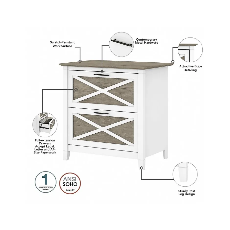 A natural fit for homes that embrace coastal and farmhouse decor, the Bush Furniture Key West two-drawer lateral file cabinet is perfect for organizing paperwork in virtually any room. Two file drawers open on smooth full-extension ball bearing slides for an easy reach to legal- and letter-size documents. Stylish X-shaped accents on the drawer panels create a relaxed style supported by a sturdy and attractive post leg design. This lateral file cabinet matches the height of any Bush Furniture Key West desk (sold separately) to create an extended work surface when placed side by side. The Bush Furniture Key West collection offers a wide variety of farmhouse furniture that makes building a complete home office or living room a breeze. This two-drawer file cabinet is tested to meet ANSI/SOHO quality standards for safety and performance and is backed by the Bush Furniture 1-year manufacturer limited warranty.