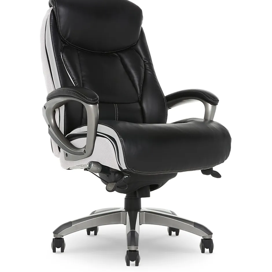 Find a reason to relax during your workday with this executive office chair from Serta, a brand known for quality and comfort. This ergonomic desk chair has layered body pillows and a pillowed headrest to provide ease while seated for long periods of time. The hand-sculpted arms and smooth bonded leather upholstery have a sleek, professional look that stands out in any work environment. Fully adjustable, this executive office chair allows the user to customize the height and lumbar zone for optimal comfort. This desk chair has a five-layer cushioning system for all day comfort and support.