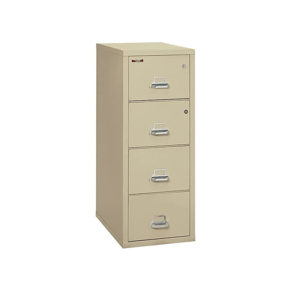 - Four-drawer vertical filing cabinet holds legal-size documents