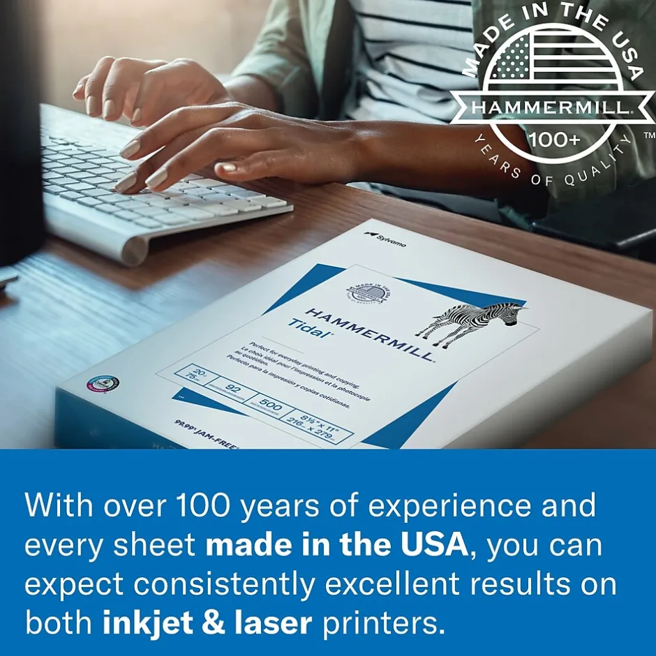 Load printer trays with exactly the right amount of paper when you use this Hammermill Tidal multipurpose paper express pack. The sturdy letter-size sheets come packaged without individual wrappings, reducing waste in your office. Each sheet in this Hammermill Tidal multipurpose copy paper express pack boasts a 20-pound paper weight that’s ideal for everyday printing needs, and ColorLok technology ensures fast drying times for smudge-free prints.