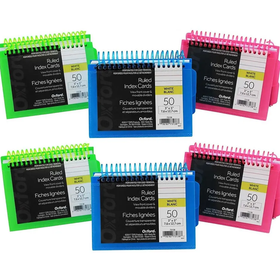Oxford® Index Cards are ruled on one side for easy note taking. The 3″ x 5″ size is versatile enough for studying, presenting, and list-making. The handy spiral design keeps all your notes self-contained for easy reference. Each card has a perforated edge for easy removal of cards. There are 50 index cards per book, cover color may vary. Features clear view front sleeve for personalization or schedules! Includes two adjustable section tabs which can be labeled for instant referencing – simply snap in and out. Made of sturdy white card stock and ruled on one side. Assorted colors: Blue, Smoke, Green, Magenta. Please allow us to select your color for you. Each spiral bound pack includes 50 cards. Sold as 6 packs for a total of 300 cards.