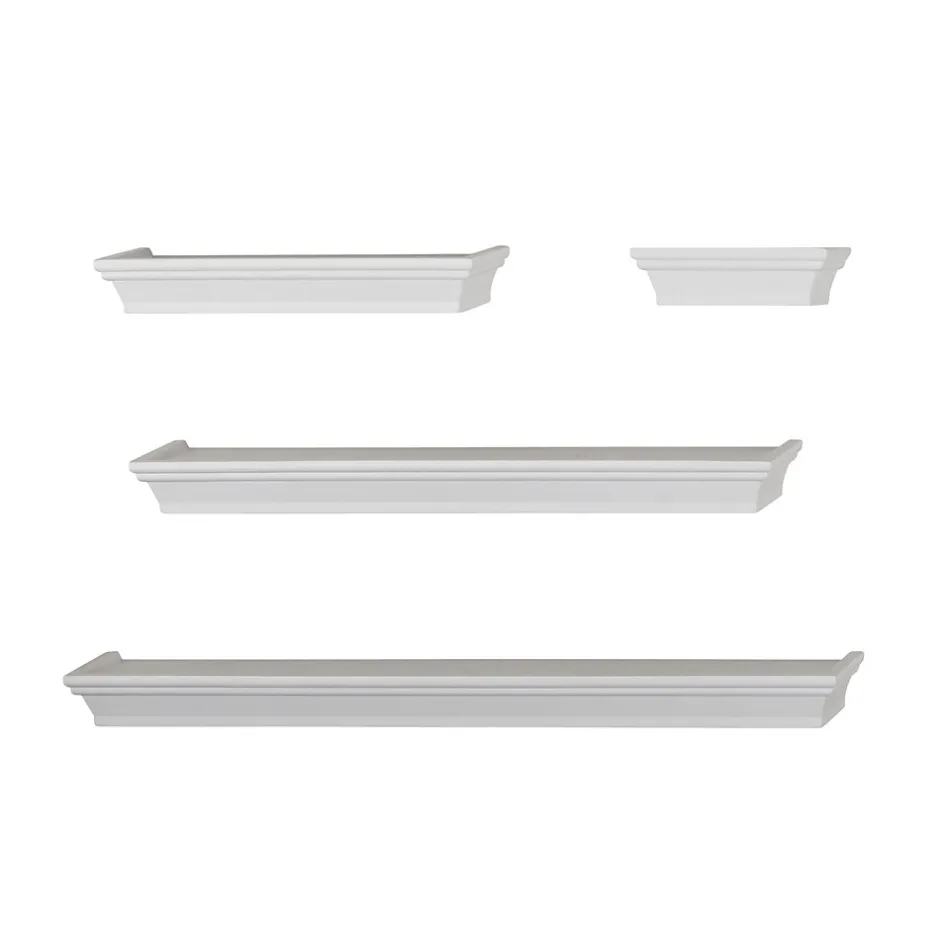 Showcase cherished photos, keepsakes, and other decorative items on these V-Light functional and attractive shelves. The four multi-size traditional wall shelves are constructed of MDF wood and feature a classic white finish to complement virtually any home or office decor. Included installation hardware makes for easy wall mounting, with no visible wiring or hardware connections. The shelves measure 6″W, 12″W, 20″W, and 24″W.