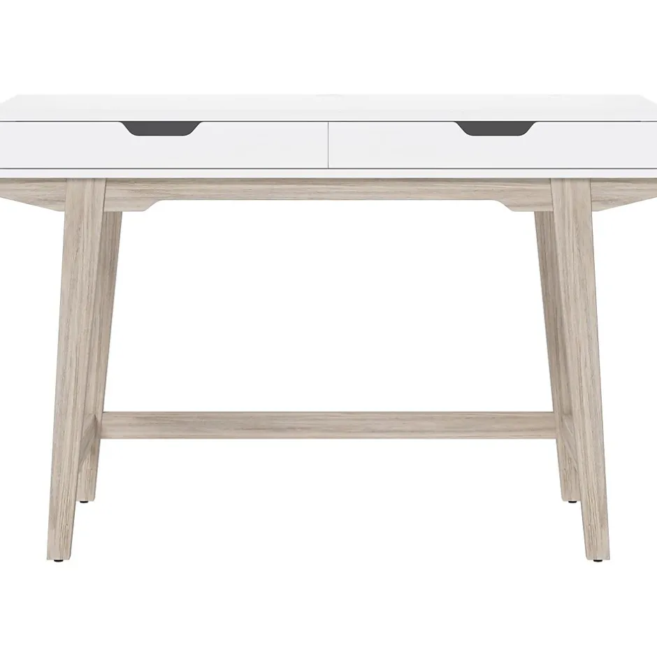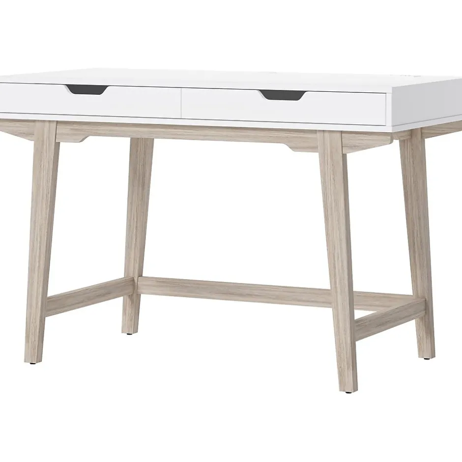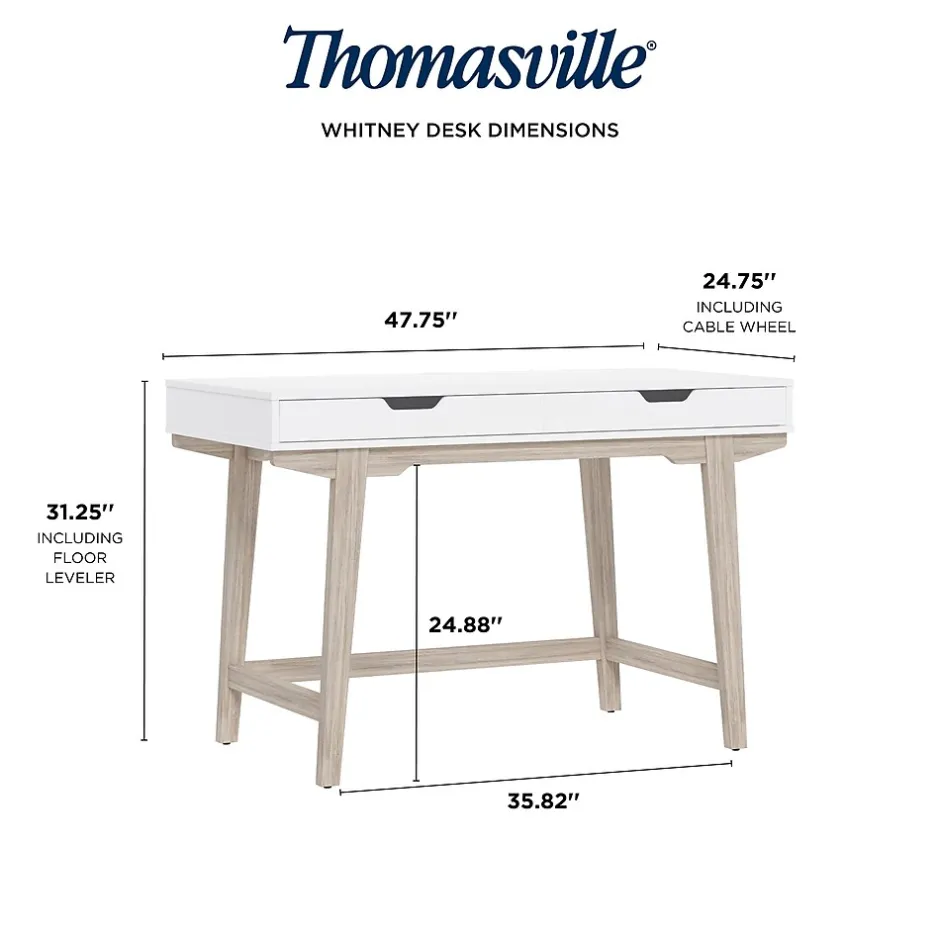 The Thomasville Furniture Whitney 48″ desk offers a chic mid-century modern look with its crisp white work surface, solid wood base and legs, features an antimicrobial laminate surface. The antimicrobial addition reduces the growth of bacteria on the desk surface. The desk features a power center with two 120V outlets and two USB ports. Two horizontal file drawers provide plenty of storage and will keep your work area free of clutter. This Thomasville Furniture Whitney desk pairs perfectly with the Thomasville Furniture Whitney lateral file as well as with the Thomasville Furniture Whitney bookcase to complete your office renovation