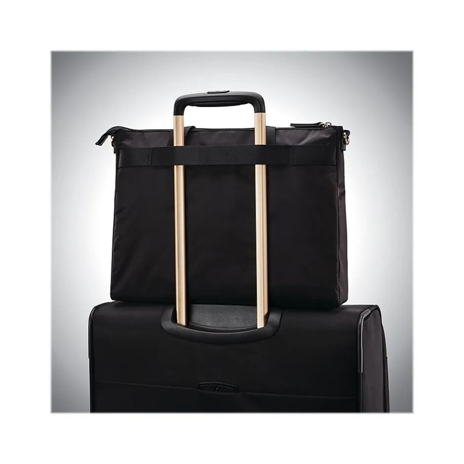 A comprehensive offering of travel and lifestyle essentials, the Samsonite Mobile Solution collection features superior functionality in timeless, lightweight styles. Slim and sophisticated, this multitasking brief offers an elegant alternative to the typical laptop bag. Carry handheld or add the strap to go hands-free as a cross-body or shoulder bag: this versatile style is the perfect choice for those who love options. Nylon fabric with vinyl trim and water-resistant coating.