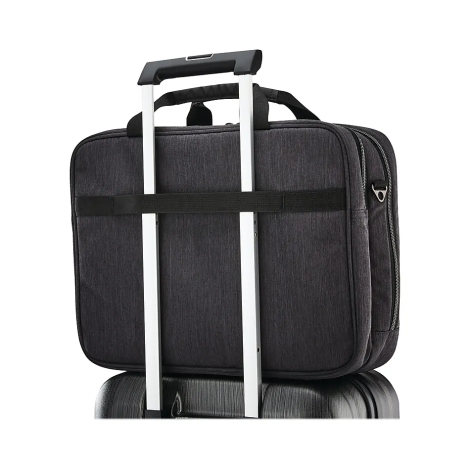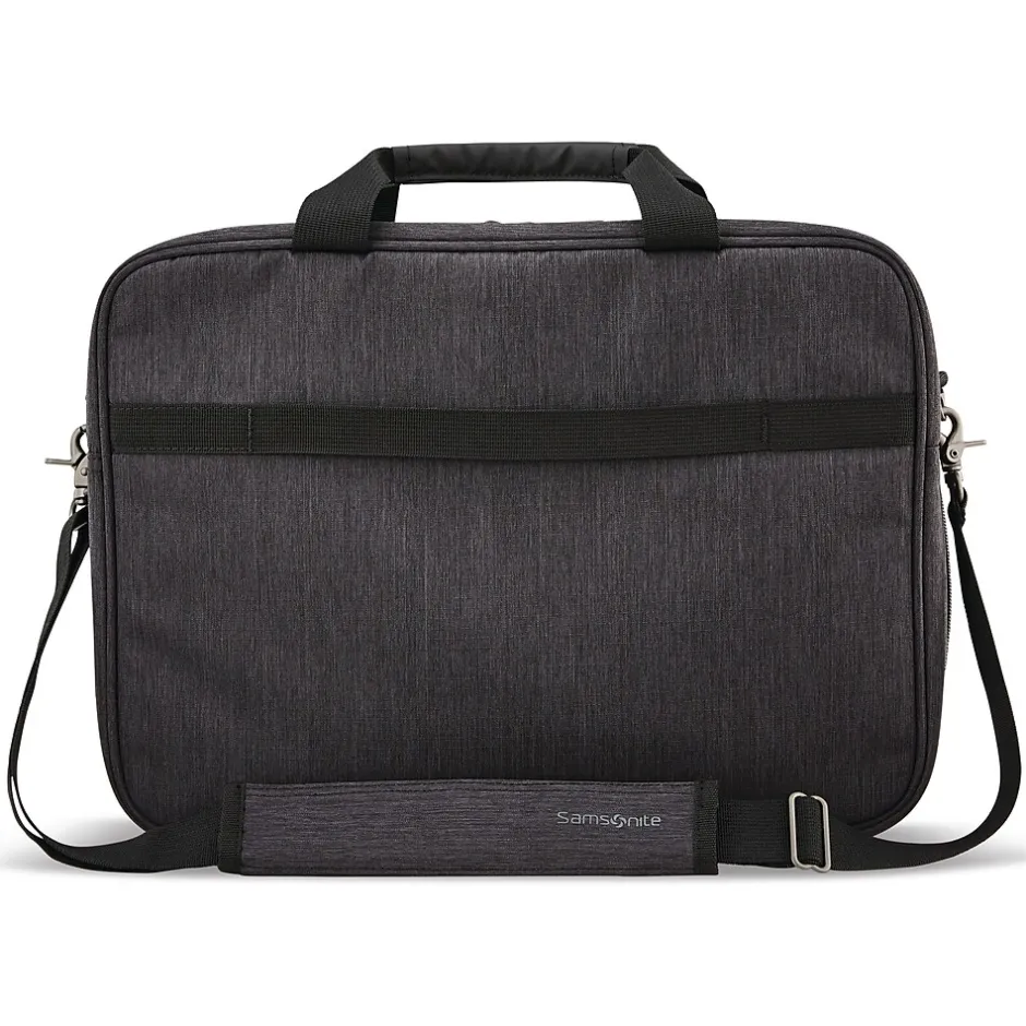 The Samsonite Modern Utility briefcase is designed to fit a more casual lifestyle and is your go-to business accessory. Thoughtful organization for all your tech needs, it provides a relaxed yet sophisticated look for your everyday needs. Sleek and compact, the modern Samsonite briefcase is perfect for business and beyond. With a fully padded main compartment, additional organization in the front pocket, and detachable strap, this briefcase is ready to go wherever you do. Features two-tone polyester ripstop with matte gunmetal hardware. The SmartSleeve fits over most upright luggage handles for easy mobility. Adjustable, removable shoulder strap is padded for extra comfort. Offers fully featured organization panel.