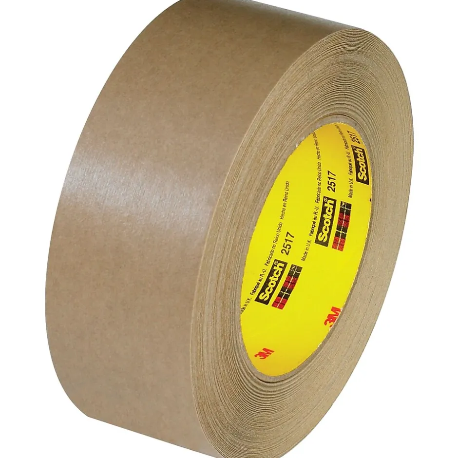 2″ x 60 yds. (12 Pack) 3M 2517 Flatback Tape. This tape works well for splicing linear boards, bundling, holding and packaging application. This tape has good backing strength and is resistant to moist conditions. Holds original shape to maintain straight paint lines. Tape may be machine dispensed Withstands temperatures up to 300 degree F. for 30 minutes. Kraft flatback paper backing with rubber adhesive.