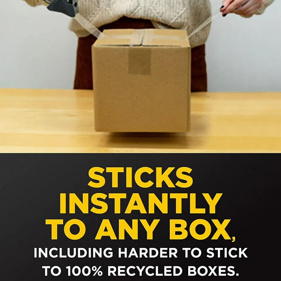 Scotch Box Lock Packaging Tape sticks instantly to any box! It has the power of extreme grip to ensure boxes stay securely sealed, even during rough handling. Its new advanced adhesive creates a secure seal over box edges, and its thickness and durability reduces splitting and tearing and makes it easier to find the start of the roll. This tape can be used to seal any type of box, including harder-to-stick to 100% recycled boxes.