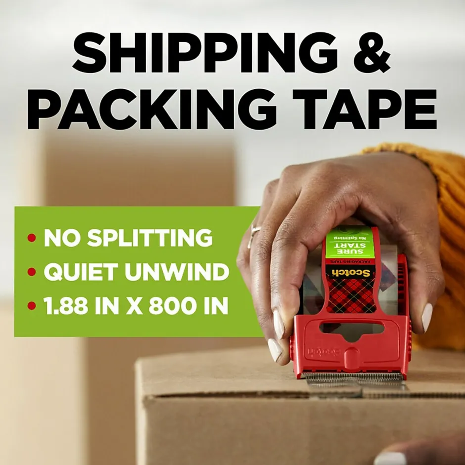 - PACKING TAPE: 6 rolls of Scotch Sure Start Packing Tape with dispensers; unrolls easily and smoothly, without a frantic search for the end of the tape