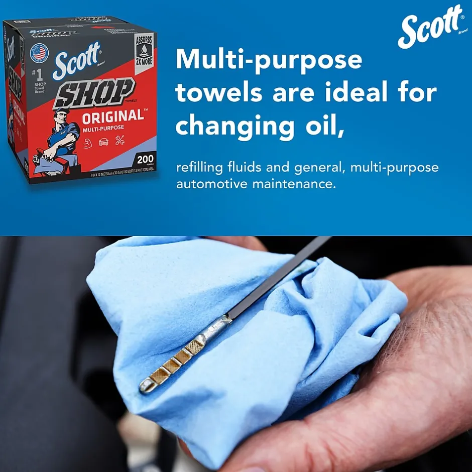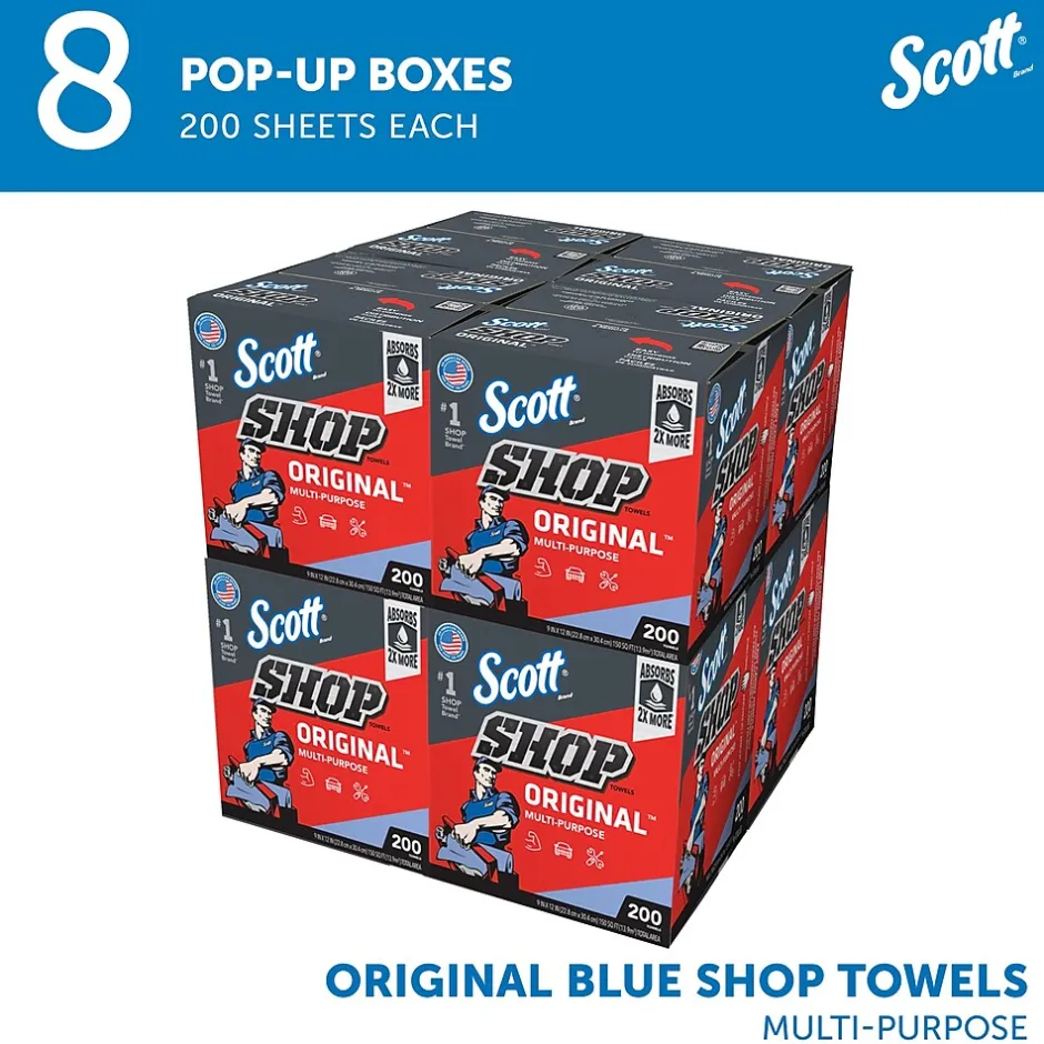 - 200 Towels/Box; 8 Boxes of Scott® Shop Towels Original™/Case; 1,600 Towels/Case; Original Blue Shop Towels; 9″x12″ sheets; Pop-Up™ Box