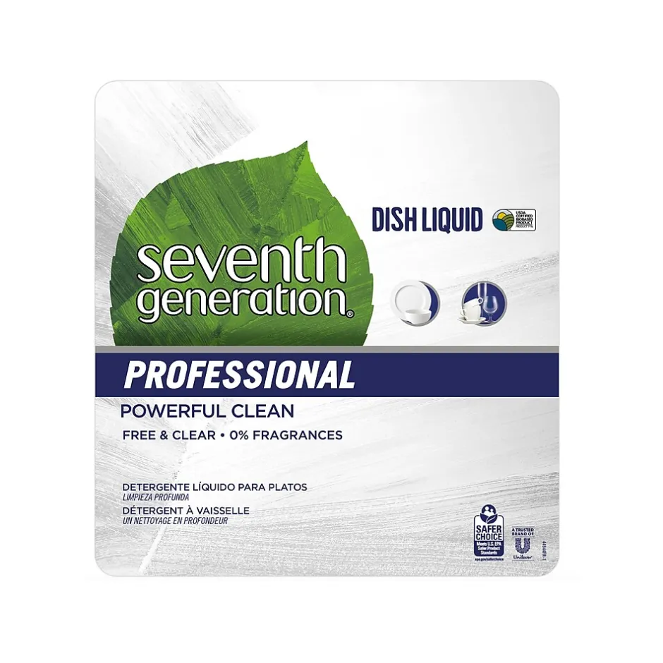Tough on dirty dishes, not the hands that wash them. The fragrance-free Seventh Generation Professional liquid dish detergent cuts through grease and powers away tough residue without the use of dyes, phosphates, or triclosan. Great for commercial and business use, including restaurants, offices, schools, daycare facilities, and hospitality.