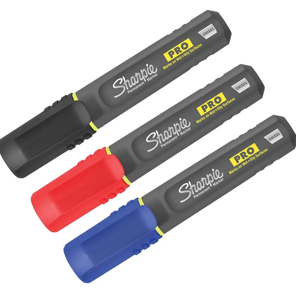 With permanent ink designed to mark on wet and oily surfaces, Sharpie PRO Permanent Markers are built jobsite-tough. The newly redesigned permanent markers better fit the needs of tradesmen with features like a medium-size anti-roll barrel shape, cap clip, lanyard loop, and more. The pack of 3 professional markers in black, blue, and red with a chisel tip will get the job done.