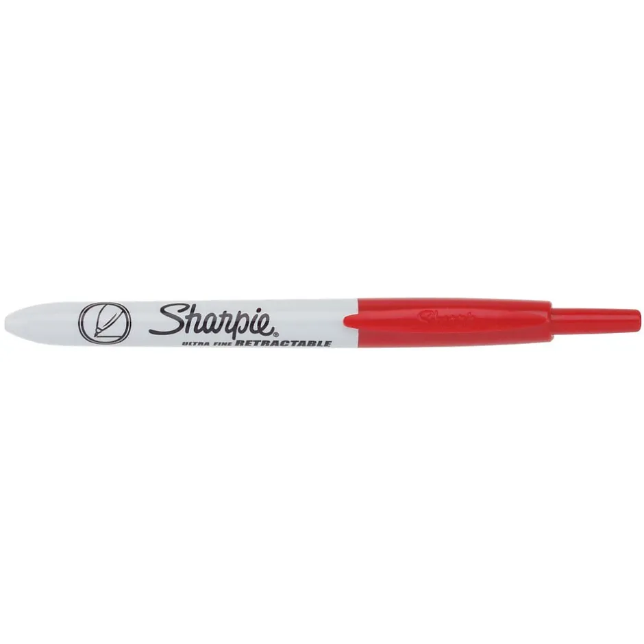 Write on almost any hard surface with these ultra-fine-point red markers. Their ultra-fine-point tips let you make permanent marks with the sharpest precision, while the quick-drying ink resists water, smearing and fading and works on glass, metal or almost any other hard surface. The permanent markers come in a pack of 12, so stocking up is simple. These Sharpie ultra-fine-point markers are retractable to prevent unwanted marking when not in use.