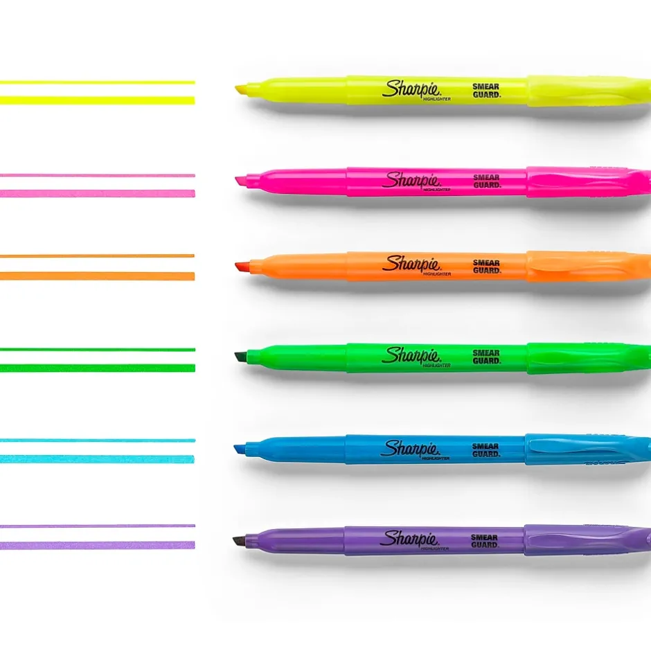 Perfect for when info is high priority and precision is a must, Sharpie Pocket Highlighters make everything highly visible. These versatile highlighters are designed to fit effortlessly in your pocket or clip to your shirt, so they’re easy to take with you anywhere. With brilliant colors in transparent, quick-drying ink and an easy gliding chisel tip that highlights and underlines both wide and narrow lines of text, Sharpie highlighters make your most important thoughts and notes jump off the page in an array of easy-to-read shades. It’s no wonder why Sharpie is the gotta have highlighter for travel itineraries, camping checklists, escape plans, and the rest of life’s major high points.