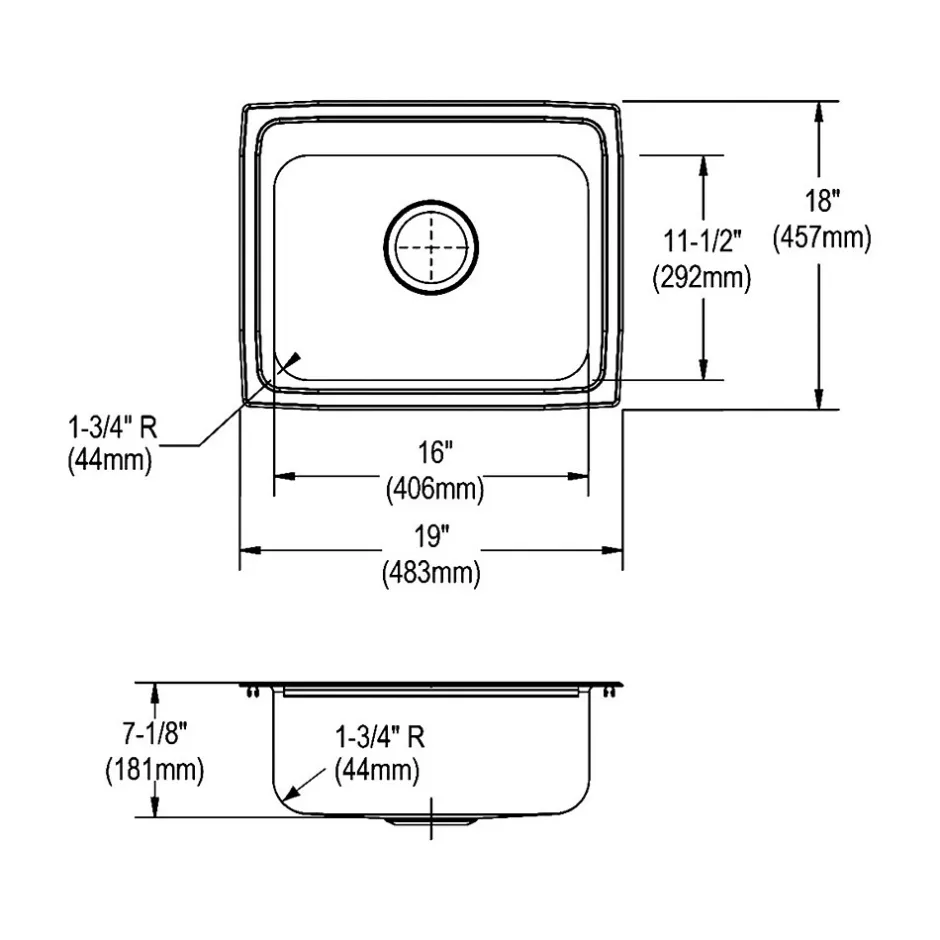 - Overall dimensions: 18″H x 19″W x 7.13″D; bowl dimensions: 11.5″H x 16″W x 7″D; drain opening measures 3.5″Dia.