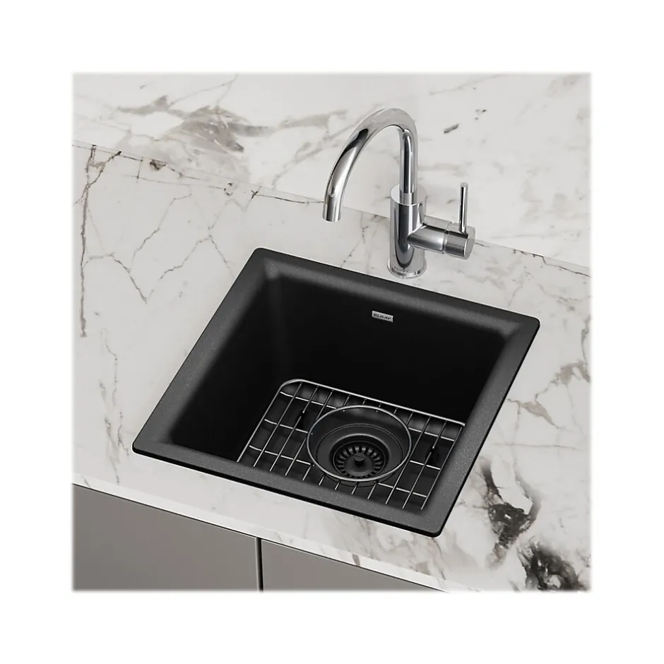 The Elkay Quartz Classic sink has a smooth surface and a visible depth to its structure. Crafted from natural quartz, the sink comes in a UV-stable black finish to add an unexpected pop of color to your space. Whether it’s a kitchen sink or a prep, bar, or laundry sink, this composite sink has the durability you need to take on tough tasks.
