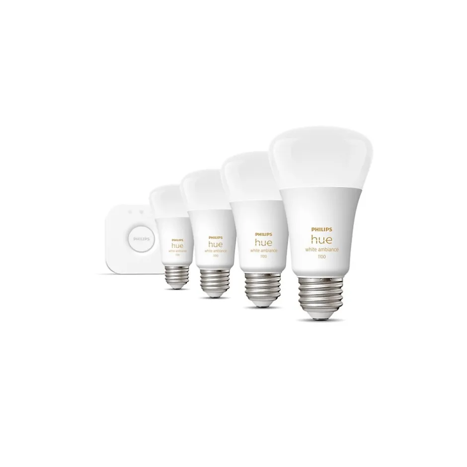 - Kit contains four Hue White light bulbs and one Hue Bridge hub, one Ethernet cable, one power adapter