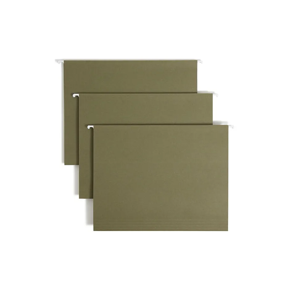 Organize documents with these hanging file folders. These folders feature special strips on their edges to guard against tearing. The interiors of these folders have a lighter color than their exteriors, which helps prevent documents from being misfiled. Each box of Smead reinforced hanging file folders comes with a label sheet and tabs to help users separate their items.