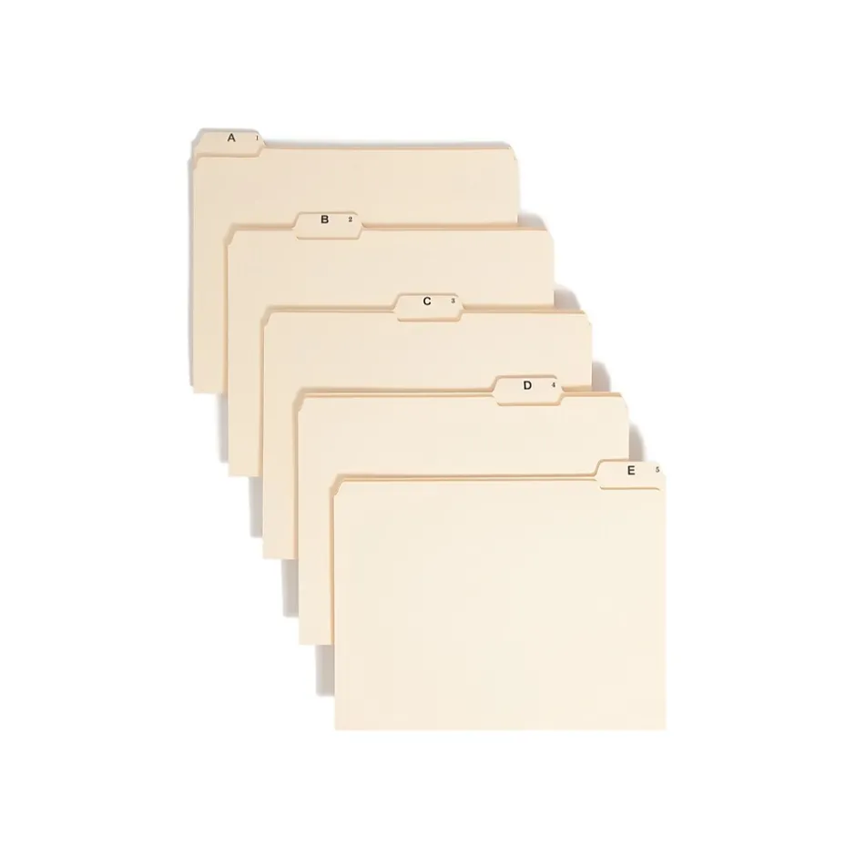 Get documents organized by sorting them into these letter-size alphabetic manila indexed file folders. The 11-point manila stock construction protects contents from everyday wear and tear, while the assorted tab positions make these folders simple to browse. This set of Smead letter-size indexed file folders features reinforced 1/5-cut tabs with bold preprinted letters for easy reading.
