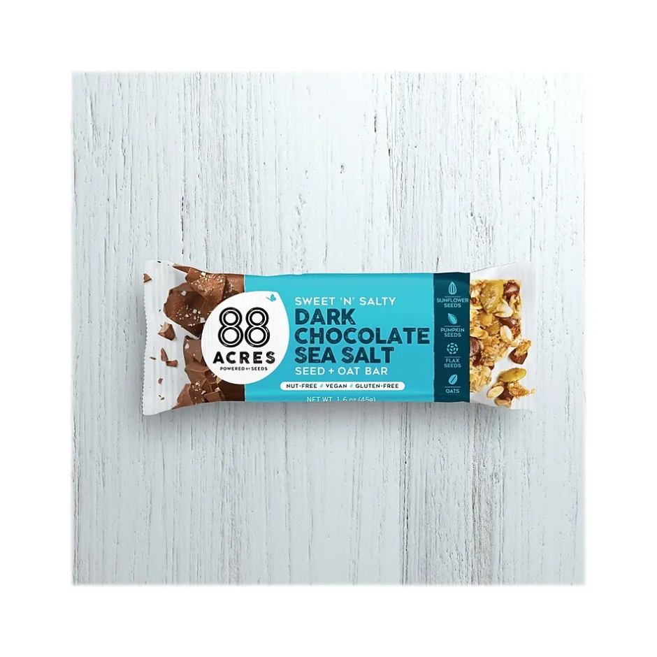 Soft-baked for a chewy texture. The 88 Acres Sweet ‘N’ Salty seed and oat bar is perfectly balanced with organic chocolate chips and sprinkled with large flakes of Australian sea salt for that taste of homemade chocolate chip cookies.