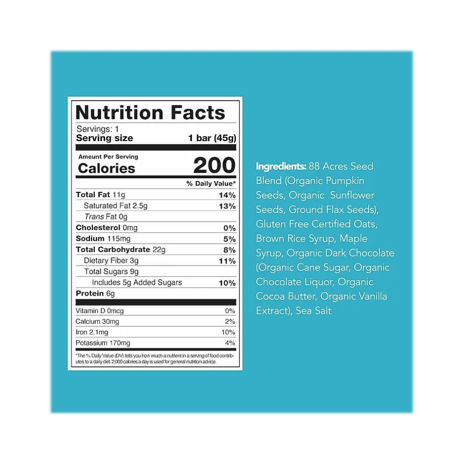 - Ingredients: seed blend (organic pumpkin seeds, organic sunflower seeds, ground flax seeds), oats, brown rice syrup, maple syrup, organic dark chocolate, sea salt