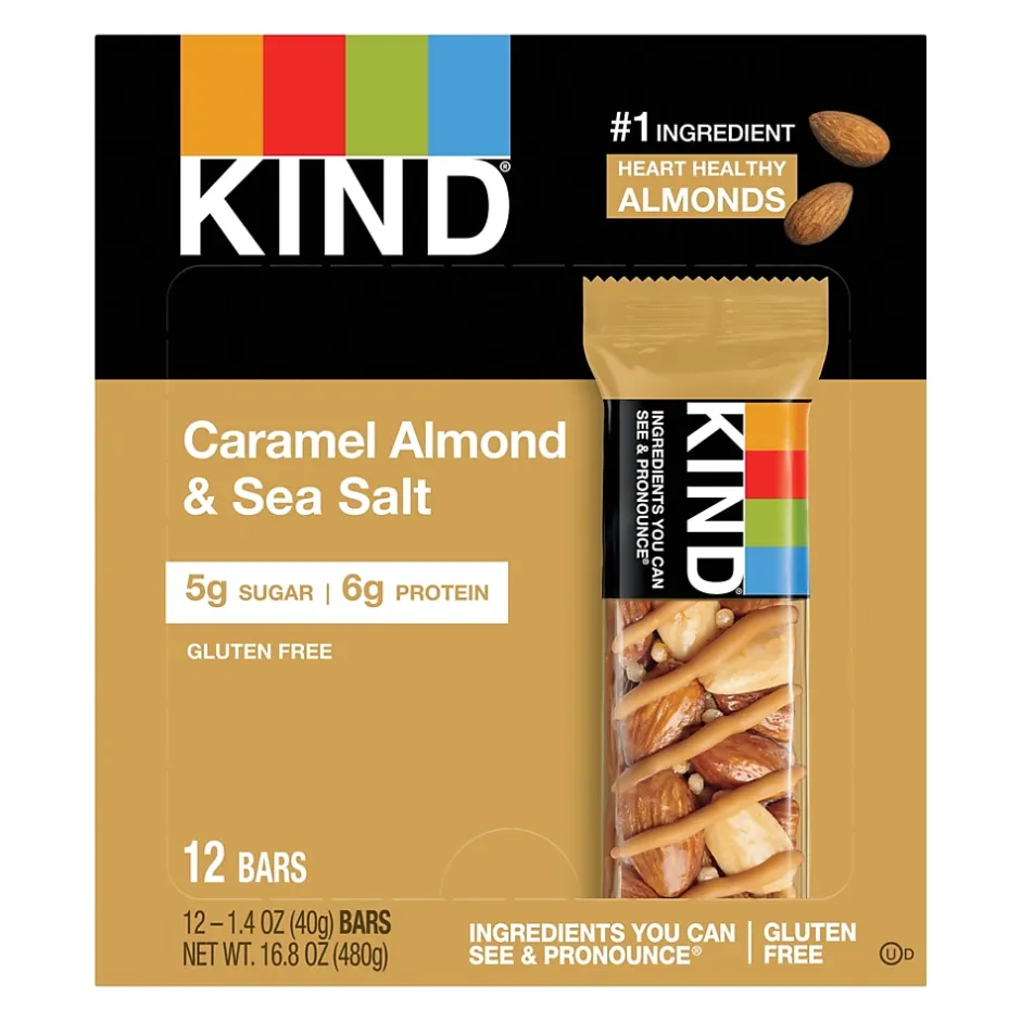 Grab these caramel, almond, and sea salt granola bars when looking for a filling, single-serving snack. These tasty snack bars are approved for gluten-free and kosher diets. This box contains 12 individually-wrapped KIND bars that can be easily stored in briefcases, purses, or backpacks for hungry moments between meals.