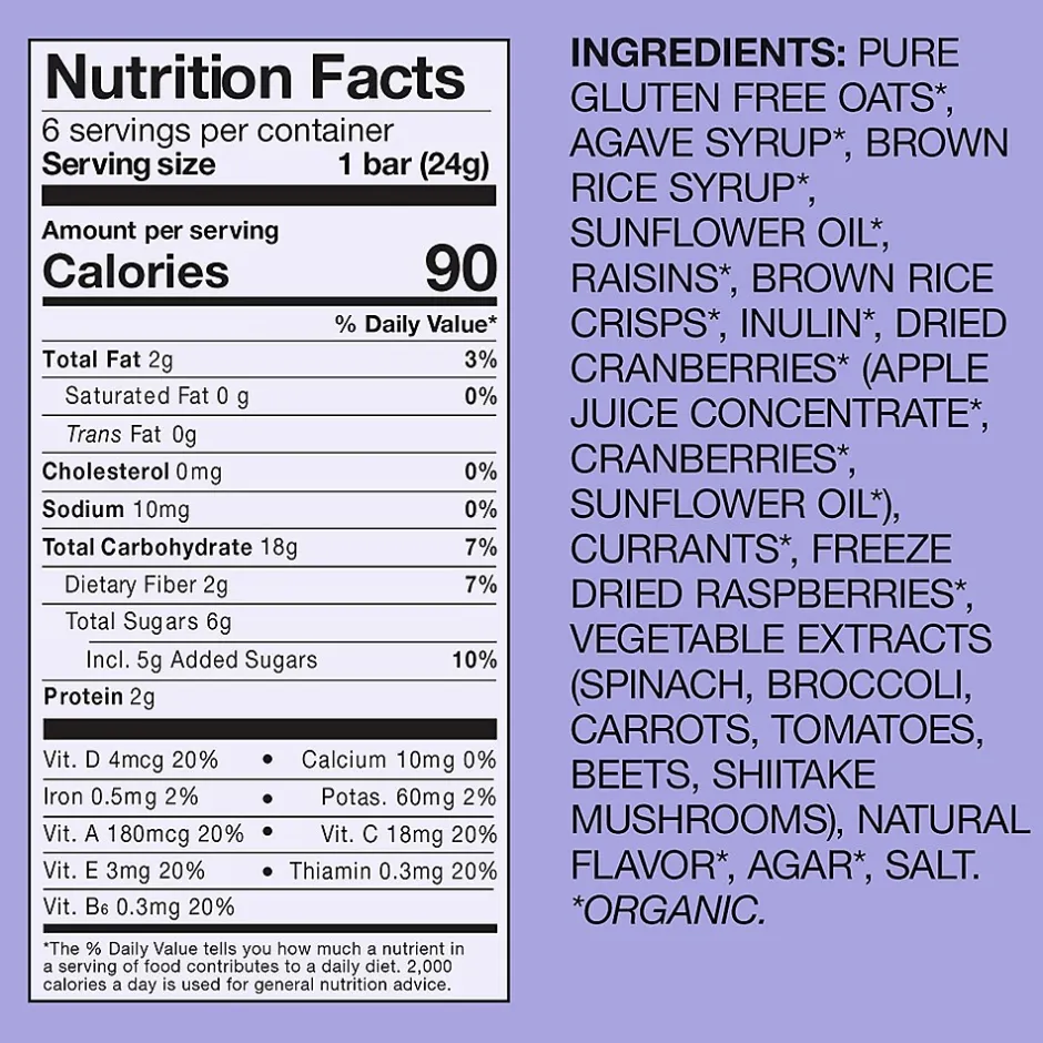 Go berry picking at snack time. Pick cranberries, raspberries and currants, rolled together with gluten-free oats. Rich in anti-oxidants and extra-rich in juicy berry flavors. Completely free of peanuts, tree nuts, soy, dairy, egg, fish, shellfish, gluten, and sesame. Vegan and made with ethically-sourced ingredients, a better option for conscious shoppers. Grab in a hurry for a quick breakfast, healthy snack, meal replacement or before a workout.