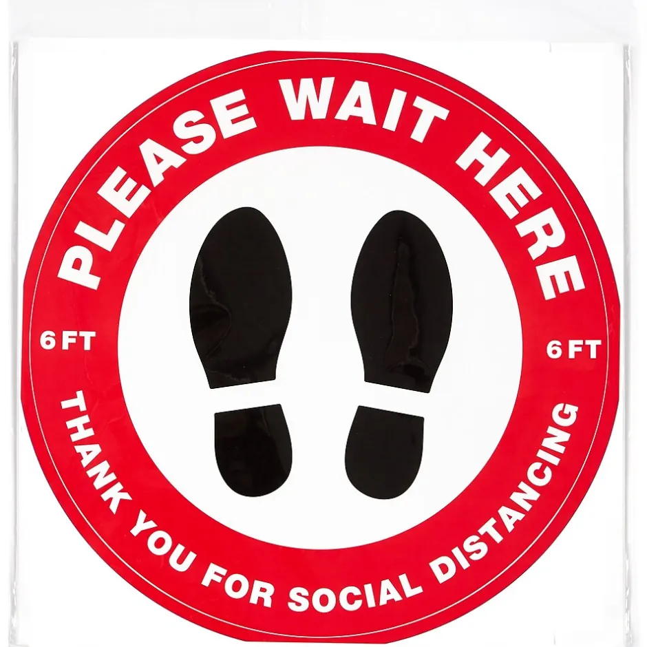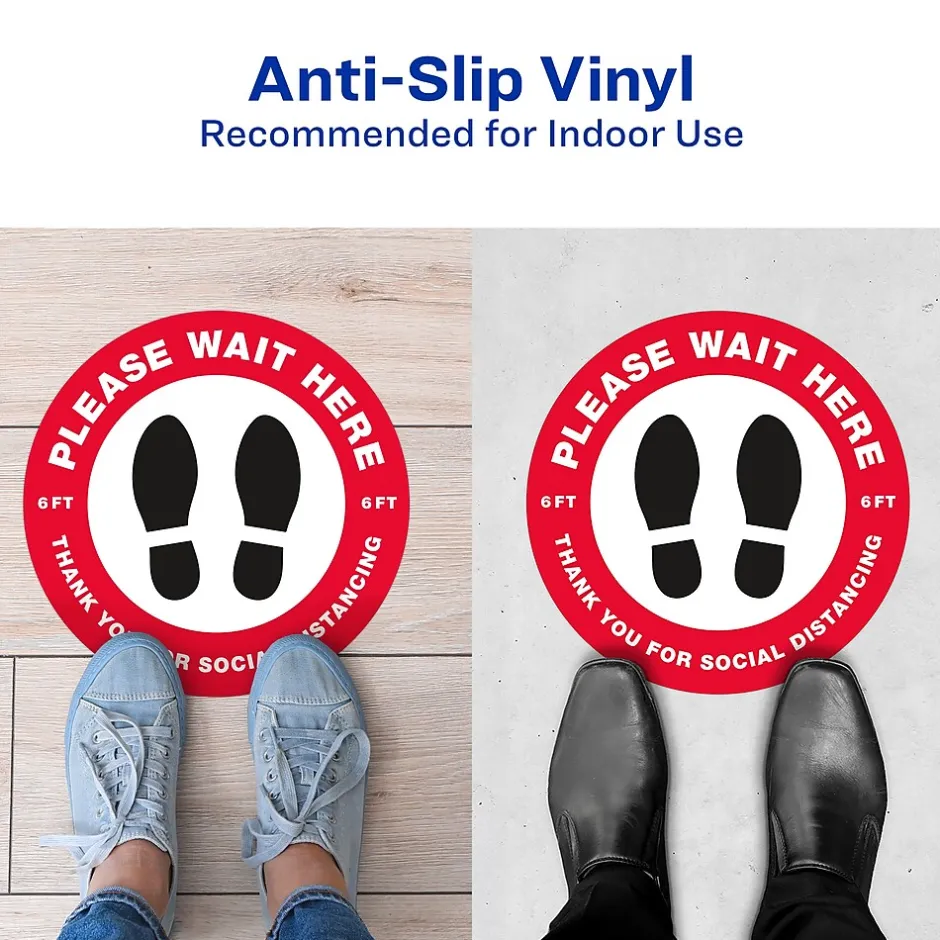 Keep people at a safe distance with round Avery “Please Wait Here” social distancing floor decals. Preprinted with an eye-catching red border and a semi-glossy finish, these large round “Please Wait Here” floor decals have a 10.5″ diameter and immediately stand out. Built to withstand the constant wear and tear of everyday foot traffic, these anti-slip vinyl floor decals are scuff resistant, water resistant and UV-coated for additional durability. Removable floor decals stick and stay to multiple indoor surfaces but also peel away cleanly. The removable adhesive also makes it easy to reposition the floor decals so that you can carefully adjust the placement of the vinyl floor decals to make sure that the spacing is just right. Preprinted social distancing floor decals are perfect for every type of location or business including retail stores, restaurants, hair salons, banks, airports and more. Includes 5 preprinted removable vinyl decals.