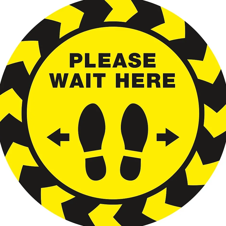 - “Please Wait Here” social distancing sign decals feature an eye-catching yellow and black pattern with a semi-glossy finish