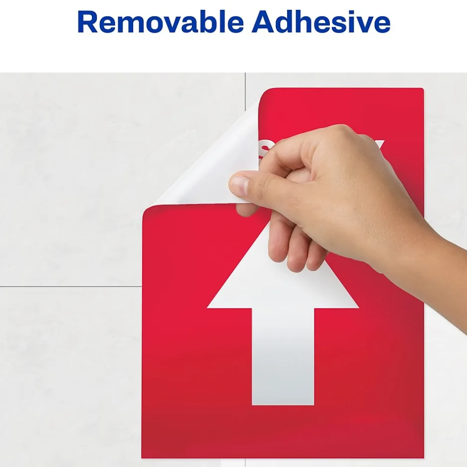 Keep people at a safe distance with Avery “This Way” social distancing floor decals. Preprinted with an eye-catching white arrow on a red background with a semi-glossy finish, these 8″ x 10.5″ “This Way” floor decals immediately stand out and help direct foot traffic. Built to withstand the constant wear and tear of everyday foot traffic, these anti-slip vinyl floor decals are scuff resistant, water resistant and UV-coated for additional durability. Removable floor decals stick and stay to multiple indoor surfaces but also peel away cleanly. The removable adhesive also makes it easy to reposition the floor decals so that you can carefully adjust the placement of the vinyl floor decals to make sure that the spacing is just right. Preprinted social distancing floor decals are perfect for every type of location or business including retail stores, restaurants, hair salons, banks, airports and more. Includes 5 preprinted removable vinyl decals.