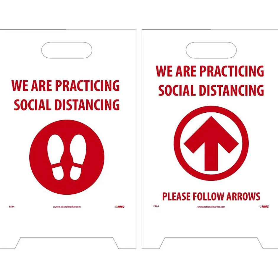 Social distancing floor signs and other crowd control products help customers in public areas, such as check-out lines, maintain their personal space. This National Marker social distancing A-frame floor sign is made of lightweight corrugated polyethylene with an imprinted message on both sides, which can be creased easily to allow folding for versatility and storage.