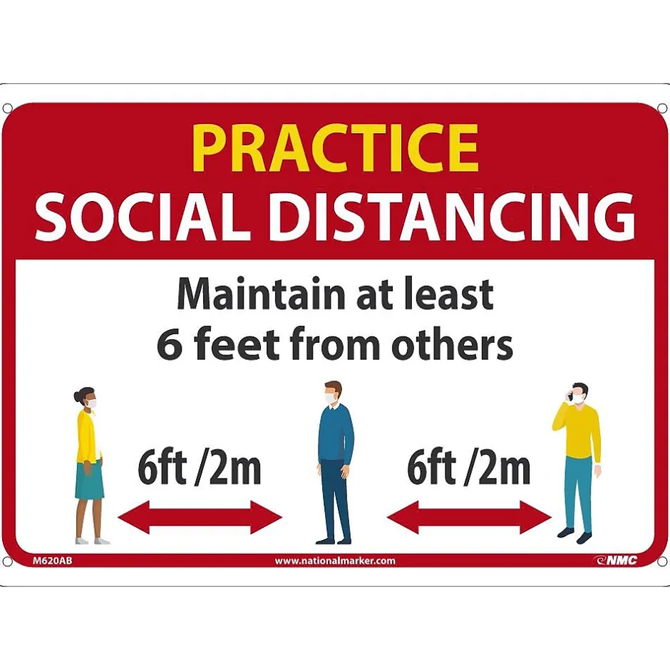 National Marker has led the response in offering hundreds of pandemic-related identification products. Use this wall sign to remind employees and visitors to help mitigate the spread of harmful germs by taking the easiest of steps, such as maintaining the safe distance from one another. This durable sign is made of 0.04″ thick aluminum with baked-on enamel on both sides. It is weatherproof and noncorrosive, making it perfect for indoor and outdoor use. This sign is supplied with radius corners and predrilled mounting holes.