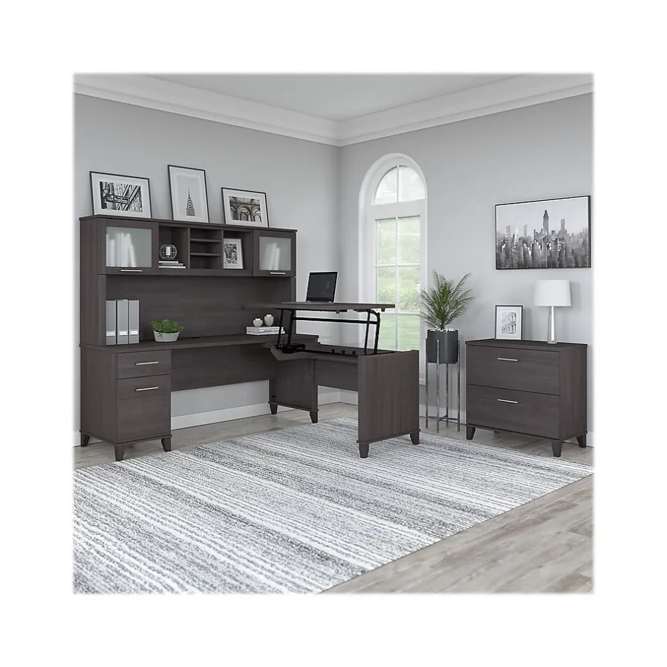 The Bush Furniture Somerset 71″W three-position adjustable desk with hutch and file cabinet offers an ergonomic solution for the home or small office. This furniture set is a perfect solution for those seeking for a stylish and functional ergonomic workspace. The mechanical Lift-n-Lock system allows the 42″W x 24″D return to lock into place at standing heights of 35″, 38″, and 41″ and easily return to a seated position. The 71″W x 24″D office desk includes its own storage with a file drawer and a box drawer for documents and supplies you want to keep close by. The hutch adds two frosted glass doors for concealed storage as well as open cubby spaces with two shelves. The two-drawer file cabinet accepts legal- and letter-size paperwork. Fixed surfaces are tested to meet ANSI/SOHO standards for safety and performance while the mechanical lift system is rigorously tested to Bush Furniture’s own quality standards. Backed by a 6-year warranty.