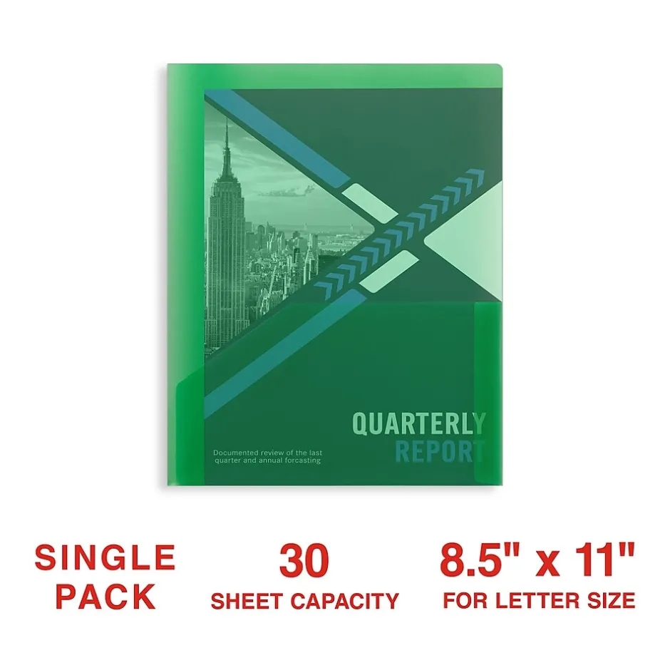 StaplesĀ® 2-Pocket Poly folder in green is made of soft and semi-translucent poly so that contents can be easily identified.