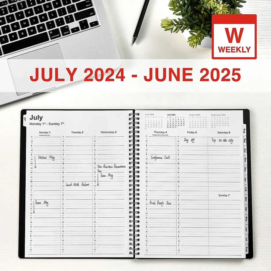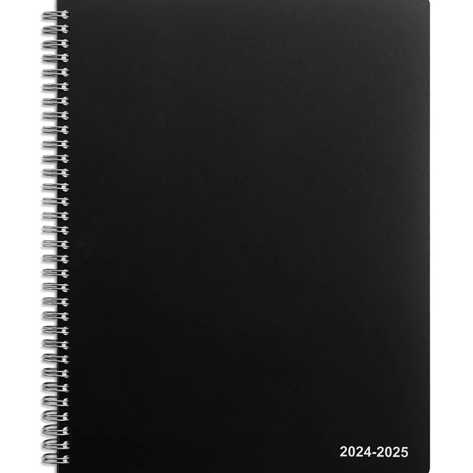 Complete office tasks with this black weekly & monthly planner. The single spiral binding holds the pages together and allows quick flip-throughs, while the poly cover material withstands daily handling. This Staples 8 x 11-inch back July 2024 to June 2025 weekly & monthly planner has 14 tabs for quick access to information and a built-in pocket for receipts and loose sheets.