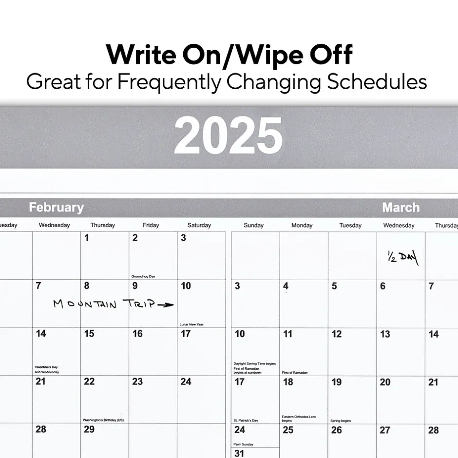 Fill in appointment dates with this erasable wall calendar. An included fine tip marker lets you easily write notes, while the gray and white design offers a distinctive look. The dry-erase laminated surface resists ghosting or staining. This Staples 36 x 24-inch gray and white erasable wall calendar has a 12-month format and supports both vertical and horizontal orientations.