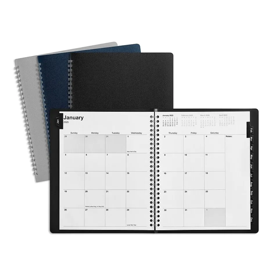Stay in the loop about upcoming appointments with this monthly planner. The twin-wire spiral binding enhances durability and makes it easy to flip through pages, while the monthly spreads have a reference calendar at the top for big picture planning. This Staples 2025 7 x 9-inch monthly planner features a tabbed layout for effortless navigation, and the Pajco cover lends a professional finish.