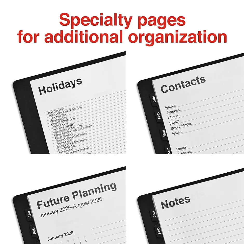 Organize your workday with this 2025 weekly appointment book. The leatherette cover protects against dust and damage, while the 14-month format helps you manage appointment times. This Staples 8 x 11-inch black weekly appointment book features a spiral binding to make flipping through pages easy and a compact size for convenient storage in your desk or briefcase.