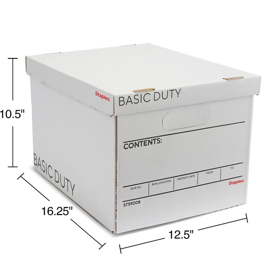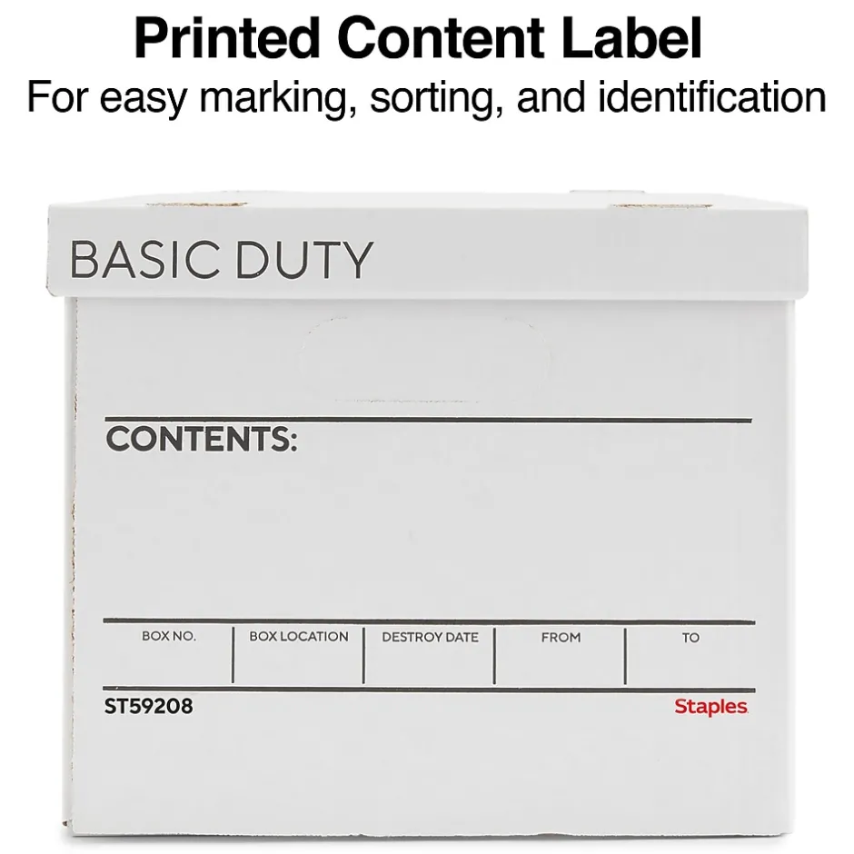 Contain bulk office files with this 10-count pack of corrugated storage boxes. A preprinted write-in area allows labeling for quick identification, while the lift-off lid offers access to stored letter-size and legal-size documents. With a stacking strength of 350 pounds, these boxes withstand piling. These Staples basic-duty corrugated storage boxes have easy-grip handles for enhanced portability.